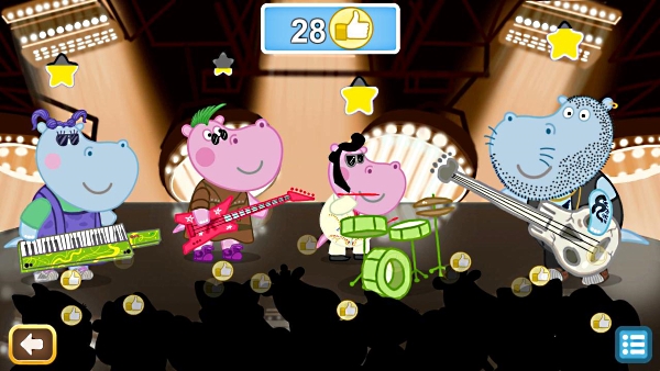 Семейство Гиппо не любит сидеть без дела. И сегодня они решили организовать собственную рок-группу и отправиться на настоящие гастроли! Подбираем каждому члену семьи костюм и музыкальный инструмент, затем выбираем одну из нескольких музыкальных композиций, и отправляем Гиппо-бэнд на сцену. Здесь следует следить за тем, чтобы играли все члены семьи, тогда лайков от фанатов будет гораздо больше.