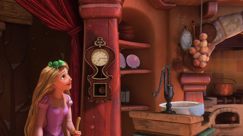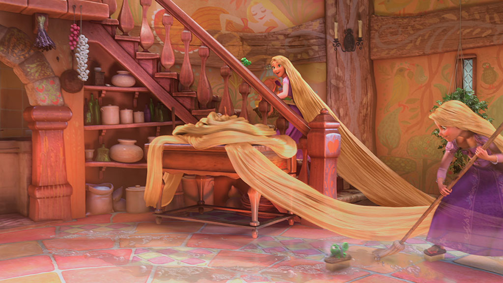 Рапунцель отлично готовит, умеет делать свечи, рисует, читает, шьёт, вяжет и вышивает, играет на гитаре — всего не перечислить. Поэтому её комната отражает стиль жизни хозяйки — расписанные вручную стены, повсюду свечки, много посуды и даже прялка, которая когда-то могла принадлежать самой Спящей красавице.