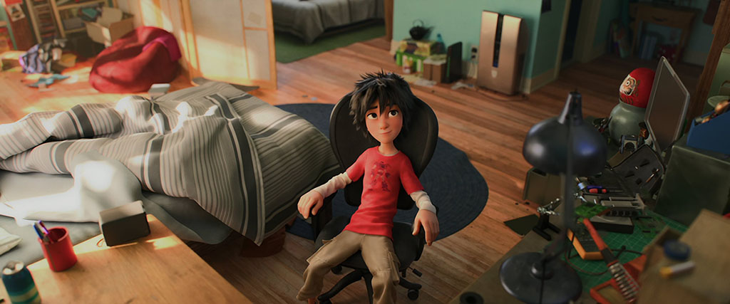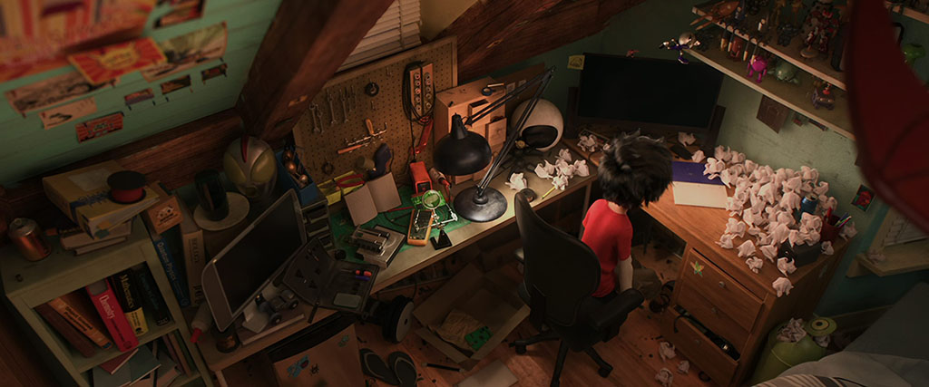 Тут и роботы для нелегальных боёв, на которые герой сбегает по ночам, и поделки, и много самого разного мусора — что тут попишешь, творцам свойственен хаос. Кроме того, на стенах висят плакаты «Мстителей», а полки украшены фигурками супергероев. Хиро — настоящий гик!