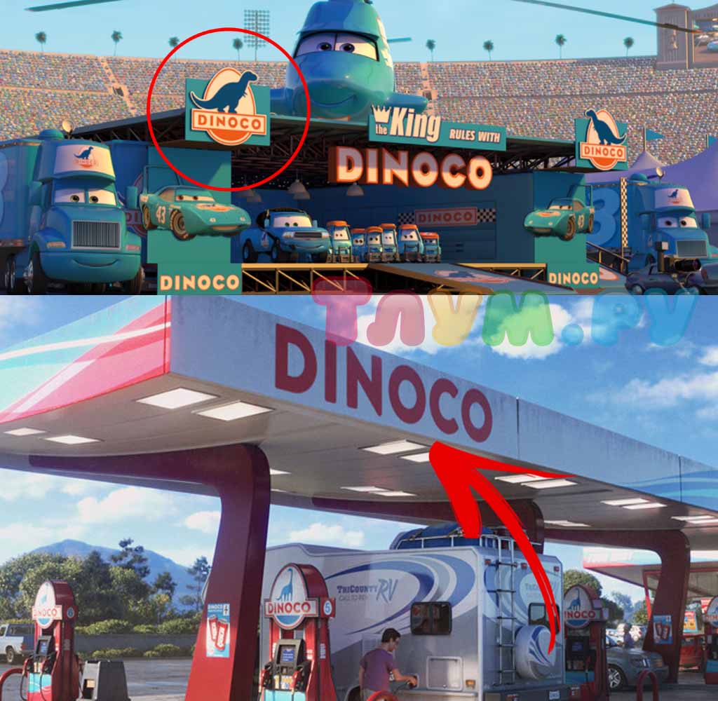 А вот и пасхалка из «Тачек». Когда герои едут в путешествие, они берут в аренду домик на колёсах, который, конечно же, нуждается в заправке. В мире мультфильмов Pixar, кажется, существует только одна фирма, поставляющая бензин — это «Dinoco» из «Тачек».
