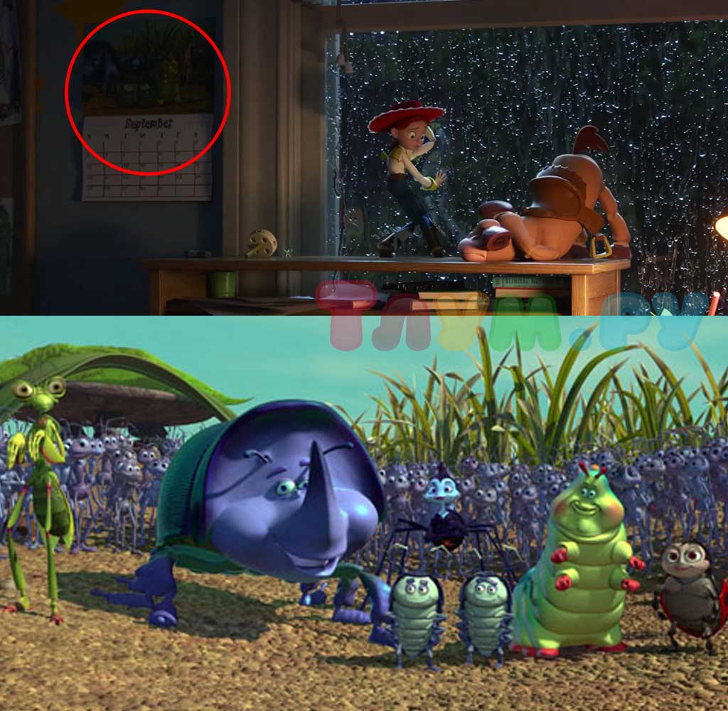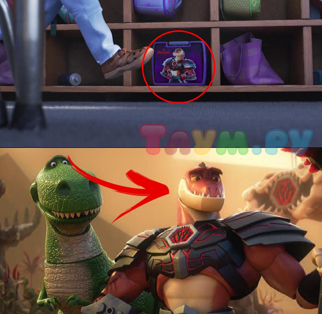 Иногда студии оставляют в мультфильмах отсылки на другие свои проекты, но тут — особенный случай, ведь в «Истории Игрушек» есть пасхальное яйцо на короткометражку о приключениях тех же самых героев. На рюкзаке одного из малышей в классе можно увидеть изображение Рептилиуса Максимуса из короткого мультика «История игрушек: Забытые временем».