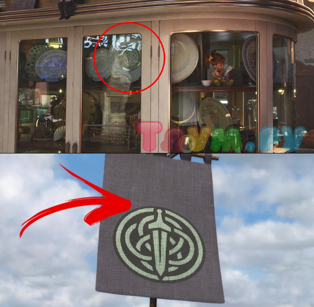 В «Истории Игрушек 4» нашлось место и для ну очень древней пасхалки. Настолько древней, что на тарелке в антикварном магазине изображён герб клана Данброх из «Храброй Сердцем». Да-да, того самого, из которого произошла Мерида.