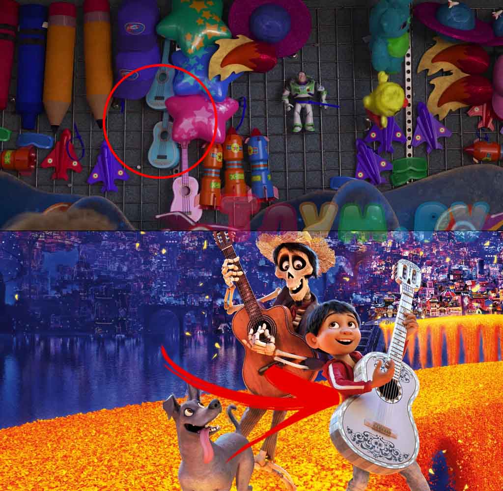 «Тайна Коко» тоже проникла в «Историю Игрушек 4» — на ярмарке можно выиграть маленькие копии гитары Мигеля в разных цветах — видимо, для того, чтобы игрушки тоже могли исполнять трогательные и зажигательные мелодии из «Тайны Коко».