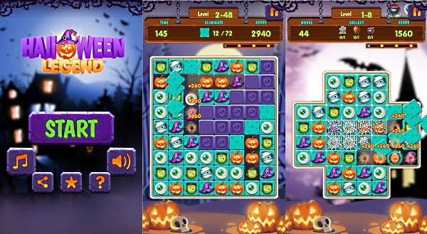 Классическая игра «три-в-ряд» с красивым и ярким хэллоуинским оформлением. Фишки в виде тыквочек, Франкенштейнов, мумий и прочих «ужасов», приправленные очень атмосферным саундтреком, создадут у детей и их родителей правильное праздничное настроение.