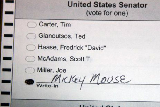 В США во время выборов участники очень часто зачёркивают имена кандидатов и вписывают вместо них Микки Мауса. Ежегодно это делает примерно 1% голосующих, а во время выборов 2008 года целых 5%. Связывают это с двумя вещами. Либо все так любят мышонка и хотят его в президенты, либо…