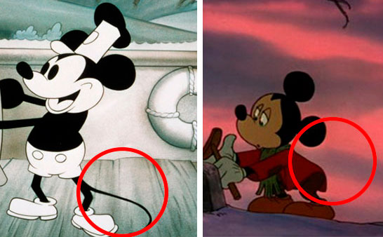 А знаете, как Микки лишился хвоста? Поначалу-то он как приличная мышь был вполне хвостат. Но чтобы сократить затраты на анимацию этой «лишней конечности», в мультфильме «Маленький ураган» 1941 года художники не стали его прорисовывать. И Микки долгое время гулял по экранам без этой части тела.