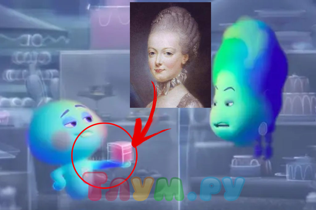 Не обошлось и без смешных исторических отсылок — одной из наставниц Души-22 была Мария Антуанетта, которой ошибочно приписывают фразу, ставшую культовой. Звучит она так: «Если у них нет хлеба, пусть едят пирожные!». В мультфильме Душа-22 протягивает королеве Франции призрачный кусочек тортика.