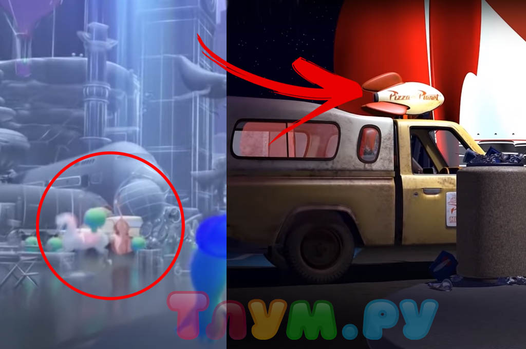 Традиционный для Pixar грузовичок Pizza Planet завален другими предметами. Его можно найти в зале, где есть всё на свете — именно там юные души ищут своё предназначение. Изначально этот грузовичок отправил Вуди и Базза из «Истории игрушек» в путешествие до «Планеты пиццы», где они встретились с Энди.