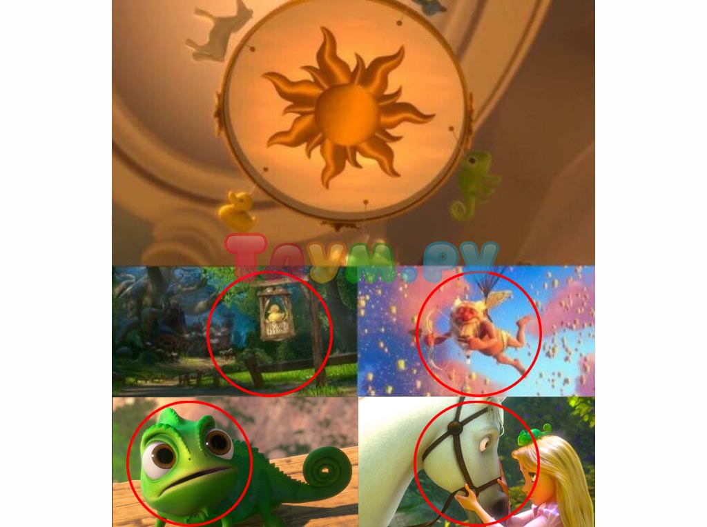 В самом начале мультфильма «Рапунцель: Запутанная история» можно увидеть настоящий спойлер к персонажам, которых героиня встретит в мультфильме. Они прячутся на её колыбельке — утка символизирует таверну Сладкий утёнок, хамелеон — Паскаля, конь Максимилиана, а за образом купидона прячется Дедок.