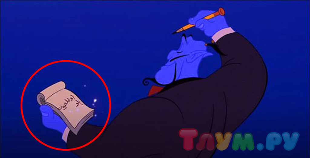 В мультфильме «Аладдин» всё арабское — в том числе и манера письма. Джинни не только пишет иероглифами, но и делает это справа налево. Такая маленькая деталь может остаться незамеченной при первом просмотре.