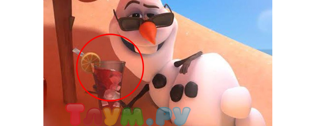 Оживший снеговик Олаф из мультфильма «Холодное сердце», кажется, ещё популярнее, чем главные героини. Поэтому неудивительно, что в одном из кадров можно найти даже его маленькую копию — правда, заметить её непросто. В сцене, где снеговик лежит на пляже, нужно обратить внимание на его коктейль — лёд в нём имеет форму самого Олафа.