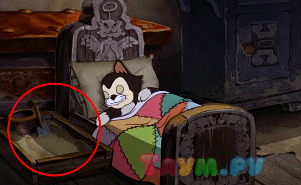 Даже у котят есть дела, которыми они не любят делиться с окружающими, но создатели фильмов всё равно не забывают прятать их в кадре. Например, в мультфильме «Пиноккио» котик Фигаро может похвастаться собственным лотком с песком вместо ночного горшка. Ведь все порядочные коты пользуются именно такими уборными.