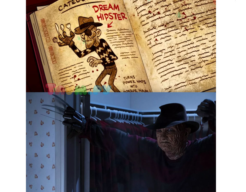 На страницах Дневника можно встретить множество самых разнообразных и необычных существ — тут и гномы, и таинственный лесной дух, и Мистер «Без-Лица», и даже Бигфут. А что скажете насчёт Фредди Крюгера из серии фильмов ужасов «Кошмар на Улице Вязов»? Правда, тут он подписан как «Хипстер из сна».