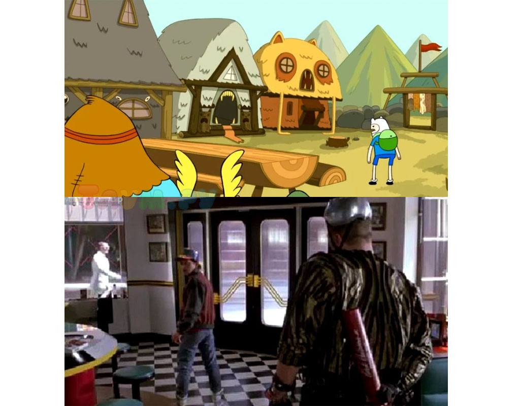 Марти МакФлай из трилогии «Назад в будущее», когда его спрашивают, не цыплёнок ли он, медленно оборачивается и говорит: «Как ты меня назвал?». Точно так же делает и главный герой «Времени Приключений», парнишка Финн.