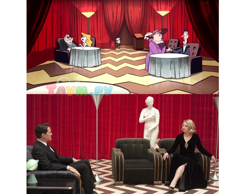 Многие называют «Гравити Фолз» «Твин Пиксом» для детей — поэтому неудивительно, что в мультсериале нашлась отсылка и на него. Ресторан, в котором Диппер встречается с Малышом Гидеоном, очень напоминает клуб «Чёрный Вигвам» из «Твин Пикса», культового телесериала девяностых.