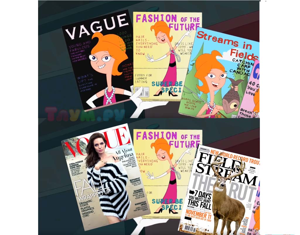 Не обошлось и без моды — тут постаралась, конечно, сестрёнка Финеса и Ферба, Кендис. Журналы, на обложке которых она красуется — отсылка к реально существующим периодическим изданиям «Vogue» и «Field Stream».
