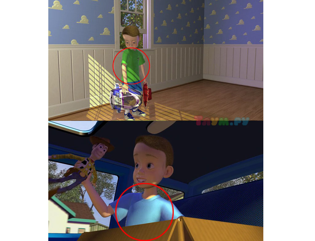 Энди не отстаёт от своих любимых игрушек — из дома он уходил в зелёной футболке, а в машине сидел уже в синей. Неужели он так горевал по своим игрушечным друзьям, что залил слезами одежду, и ему пришлось срочно переодеваться?
