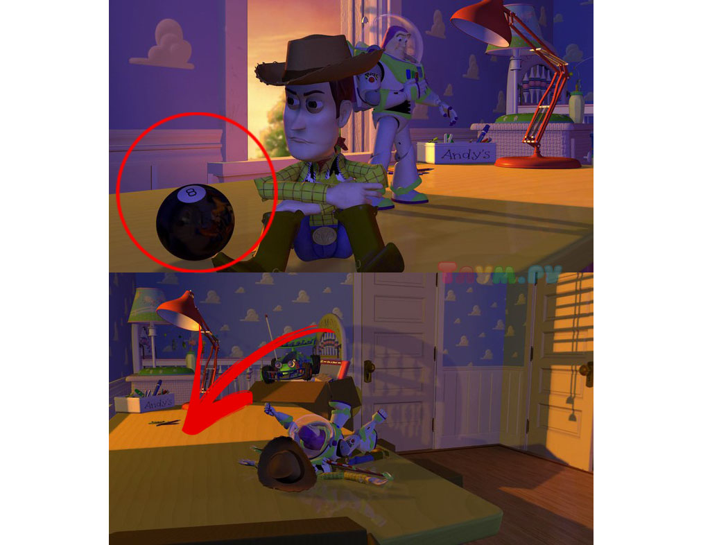 А вот и шар-восьмёрка — он особенно волшебный, ведь он умеет не только гадать, но и появляться и исчезать. Когда Энди заходит в комнату с Баззом и Вуди и бросает их на стол, шара нет, но буквально в следующем кадре он появляется чудесным образом.