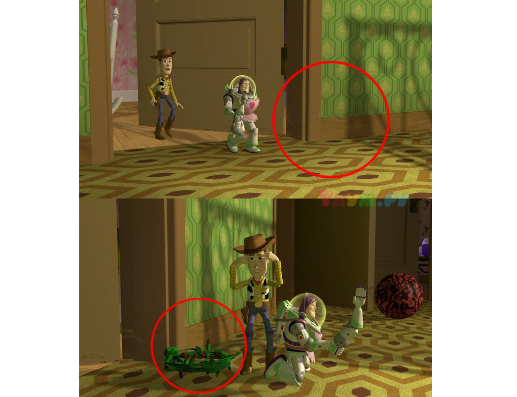 В мире игрушек нет ничего постоянного, и многие предметы часто пропадают и появляются. Как, например, этот мяч. Вот Базз готовится к «шагу в бесконечность» и мяча под ним нет, а вот он падает, и мяч таинственным образом появляется прямо под ним. Просто чудо какое-то! Кстати, этот самый мячик появляется почти в каждом мультфильме студии Pixar.