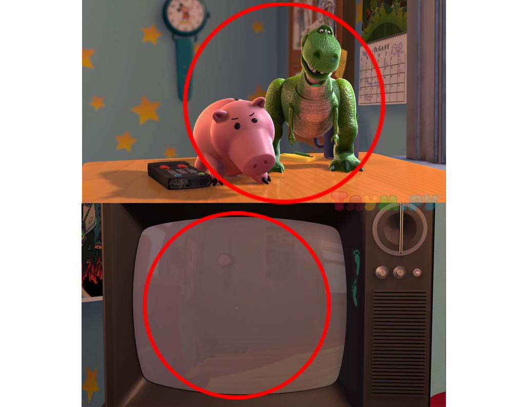 Может, игрушки из этого мультфильма вампиры? Иначе как объяснить, что Рекс и Хэмм стоят напротив телевизора и смотрят рекламу, но когда телевизор выключается, их отражения не видно, хотя в нём можно увидеть всю комнату?