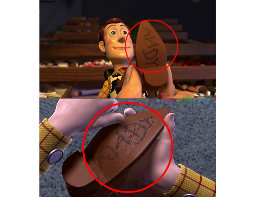 Когда Вуди закрасили надпись на подошве обуви, можно было заметить, что имя Энди написано начиная с носка и до пятки. В дальнейшем, когда ковбой сотрёт краску, можно увидеть, что надпись изменила своё положение, и теперь начинается от каблука и идёт к носку. Очевидный ляп!