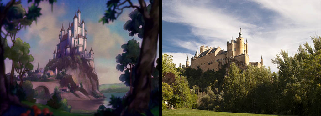 Основная часть событий первой диснеевской полнометражки происходит, как известно, в лесном шахтерском домике, но без шикарного дворца королевская семья никак не могла обойтись. В завидных хоромах злой мачехи угадываются очертания замка Альсакар, что расположен в древней кастильской Сеговии, Испания.