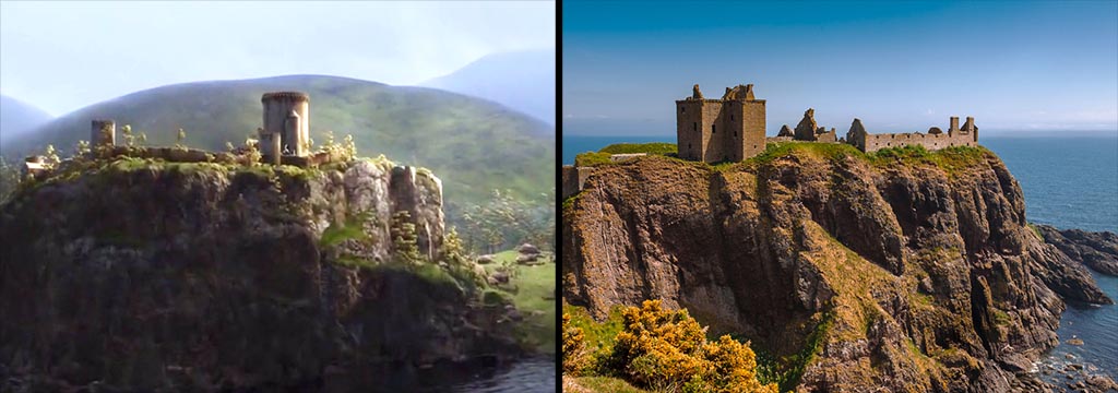 И, разумеется, аниматоров — в замке Данброх из «Храброй сердцем» отчетливо виднеются формы Данноттара, да и место чрезвычайно похожее. Реальный «дом Мериды» расположен в двух милях от города Стонхейвен и открыт для всех любителей старинных развалин.