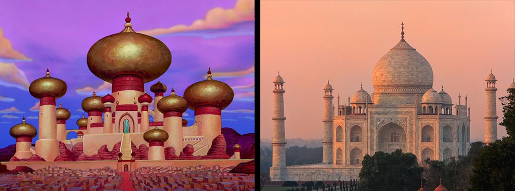 Что-то мы все про Европу — а ведь богатство восточных дворцов тоже было обстоятельно отражено в мультипликационных мирах. Например, легендарный Тадж-Махал, являющийся одновременно мавзолеем, мечетью и символом великой любви между могольским падишахом и его обожаемой женой. Да что рассказывать — это ведь одно из «новых чудес света» и самое узнаваемое строение в Индии.