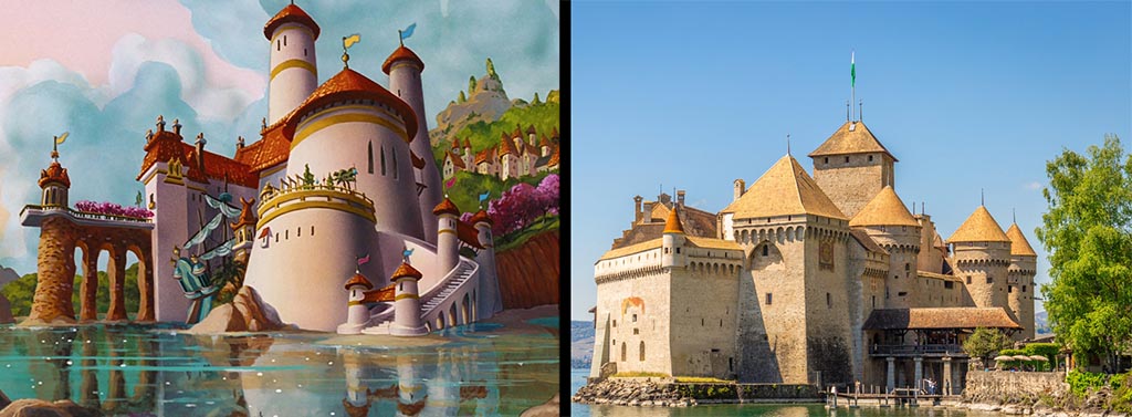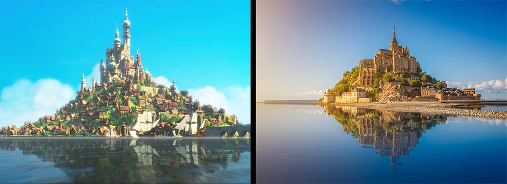 Как и объект вдохновения для аниматоров — помимо резиденции родителей Рапунцель, в сходстве с Мон-Сен-Мишель уличают и вышеупомянутый замок принца Эрика из «Русалочки». На наш взгляд, Шильон на эту роль больше подходит, впрочем, смысл спорить, если художники могли черпать вдохновение из множества мест одновременно.