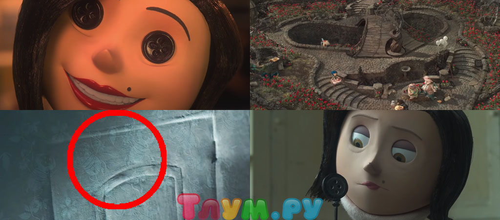 Чтобы посмотреть мультфильм, необязательно читать одноимённую книгу. Чтобы понять, что Другая Мама существует, необязательно ждать её появления. Визуальная часть показывает это: небольшая прогулочная зона возле дома представляет из себя лицо Другой Мамы, на обоях в доме изображены жуки (основная еда антагонистки), ключ от двери в другой мир украшен пуговицей. Зрителей подготавливали к перемещению между мирами.