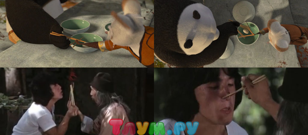 Лучше бы о Джеки Чане, ведь этот факт отсылает к его актёрской работе. В первой части франшизы о панде По показали забавный бой, исполненный палочками для еды. Всё это не кощунство и не оригинальная выдумка сценаристов. Точно такая же сцена происходила в фильме «Бесстрашная гиена». Было бы ещё круче, если бы По сражался за пищу с мистером Обезьяной, его в оригинале озвучил сам Джеки.