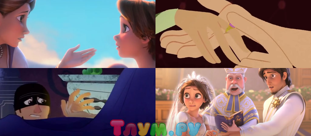 Сцена встречи Рапунцель и её родителей — на руке королевы нет кольца. Короткометражка — мы узнаём, что обручальные кольца принадлежали её бабушке. Стоп, откуда? Почему своё не носит? Всё это было долгоиграющей заготовкой для зрителей, и узнали тайну лишь те, кто «осилил» мультсериал. Там-то и показали пропажу одного из колец. Куда оно делось? Юджин знает, ведь именно он в прошлом, занимаясь воровством и отказываясь вести себя соответствующе статусу, украл драгоценность у королевы. О чём даже успел забыть!