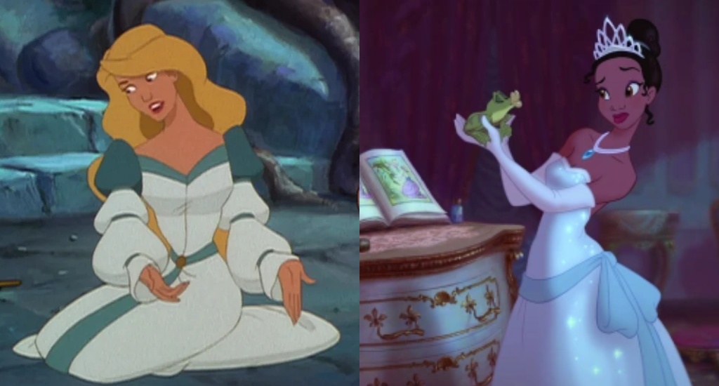 В чём схожесть: превращение главной героини в другое создание, злой колдун, проверка прочности чувств и немного принцессности или принцевости, когда речь идёт о «Принцессе и лягушке».