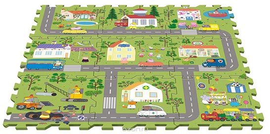 Если ваш ребенок все еще обожает «Свинку Пеппу», то ему точно понравится этот коврик. Его можно разложить дома или на улице, материал не пропустит влагу и сохранит тепло. Это не просто ковер, это пазл из 9 частей, которые образуют собой дороги, по ним можно катать машинки. Постройте свой город и придумайте новые приключения любимым героям!