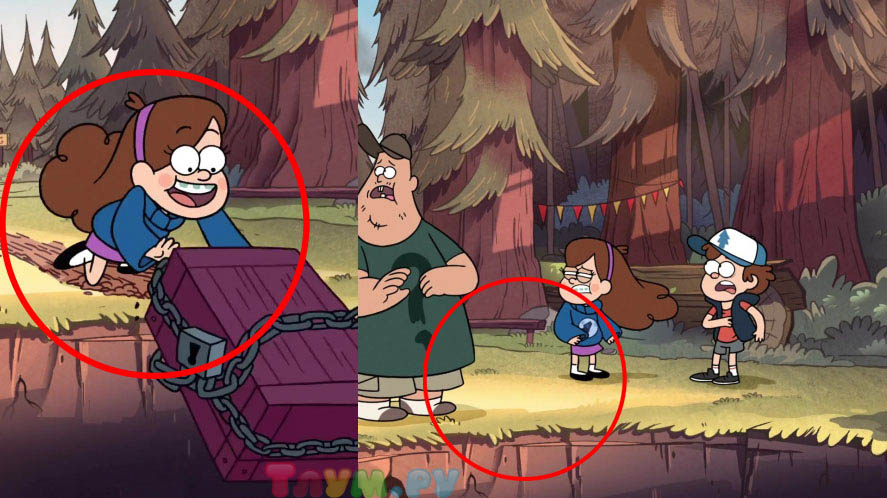 В эпизоде «Бездонная Яма» можно заметить, как Мэйбл собирается скинуть вниз огромный железный ящик, перемотанный цепью. Он настолько тяжёлый, что девочка не может его поднять, поэтому ей приходится тащить его по земле. Мы видим, что он оставляет за собой очень заметный след на земле, но, как только ящик падает вниз, исчезает и след.