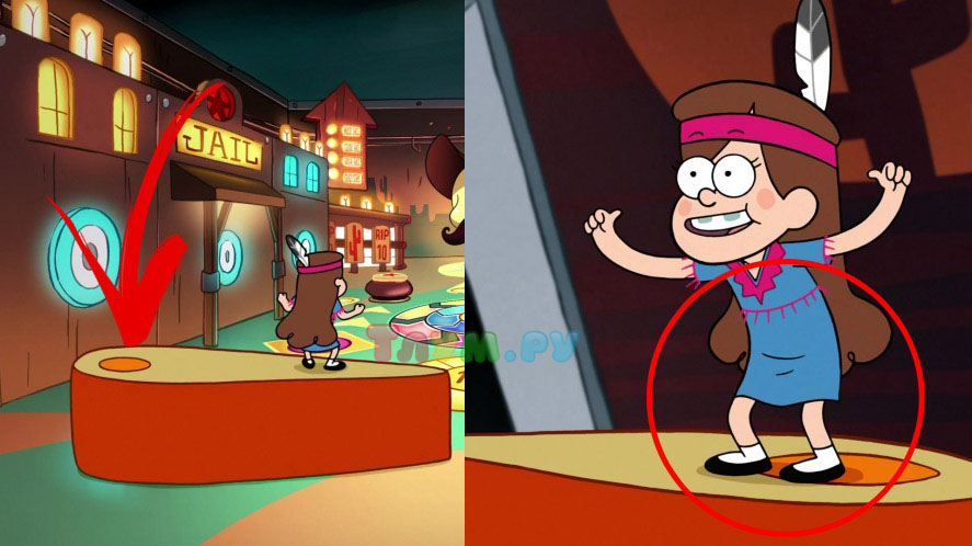 Когда Диппер, Мейбл и Сус попадают в игру, девочка, чтобы отвлечь врага, танцует на одном из рычажков, на кружочке. Но кадр сменяется — и она уже довольно далеко от того места, где стояла секунду назад. Неужели это телепортация?