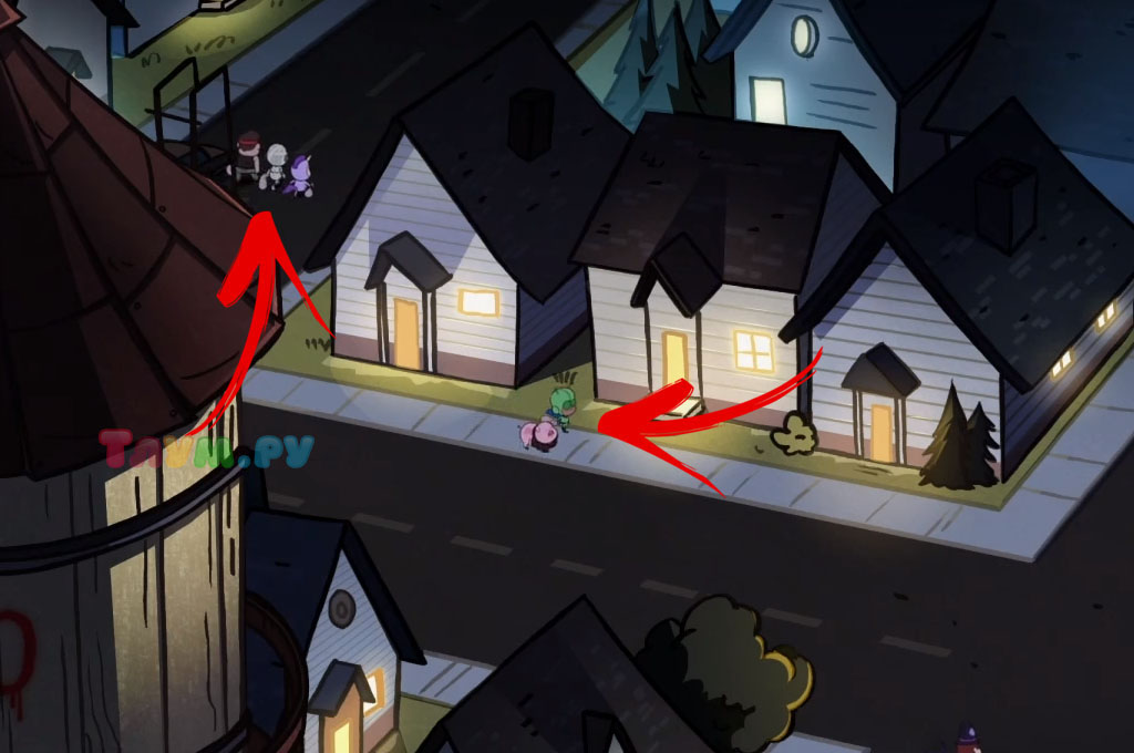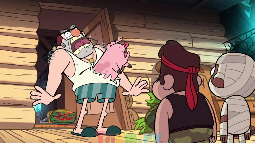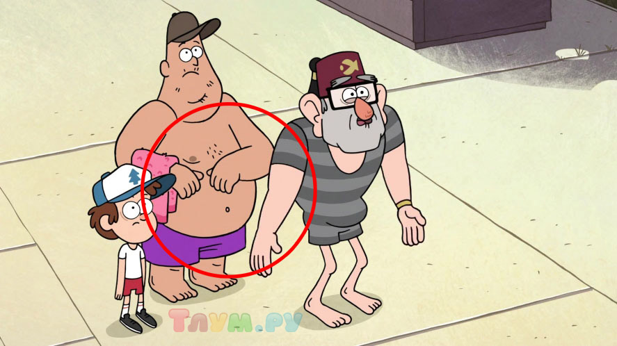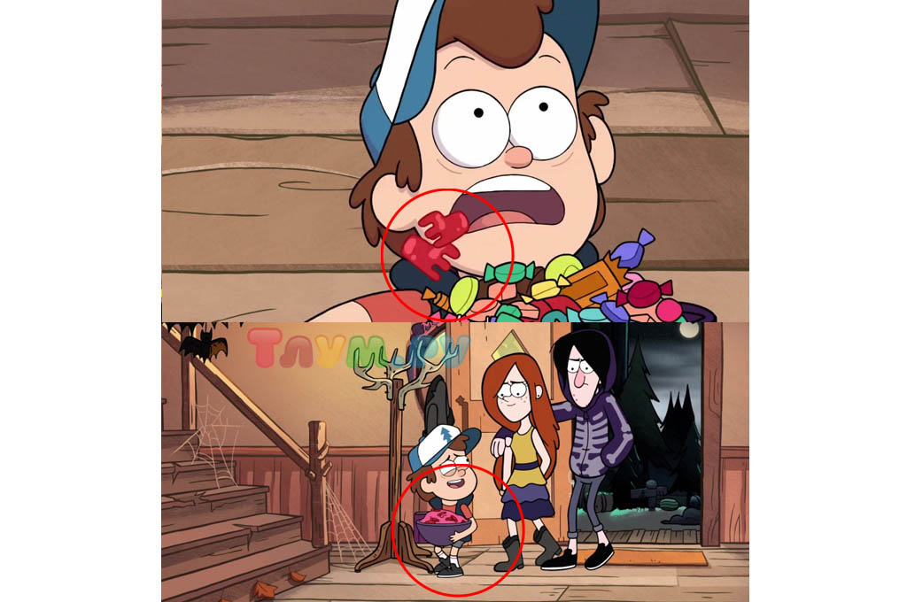 А в следующем моменте сразу несколько ляпов! К дяде Стэну приходят несколько ребят в костюмах мумии и пирата. Они выпрашивают угощения, а мистер Пайнс пытается напугать их. Из его живота с громким визгом вырывается свинка Пухля. И всё это — за какие-то несколько секунд. А дальше нам показывают городок Гравити Фолз, где можно увидеть и Пухлю, который гуляет по улице с каким-то ребёнком, и это вовсе не Мейбл! И, что самое интересное, в том же кадре можно заметить ребят, которые только что выпрашивали у Стэна конфеты. И как успели?