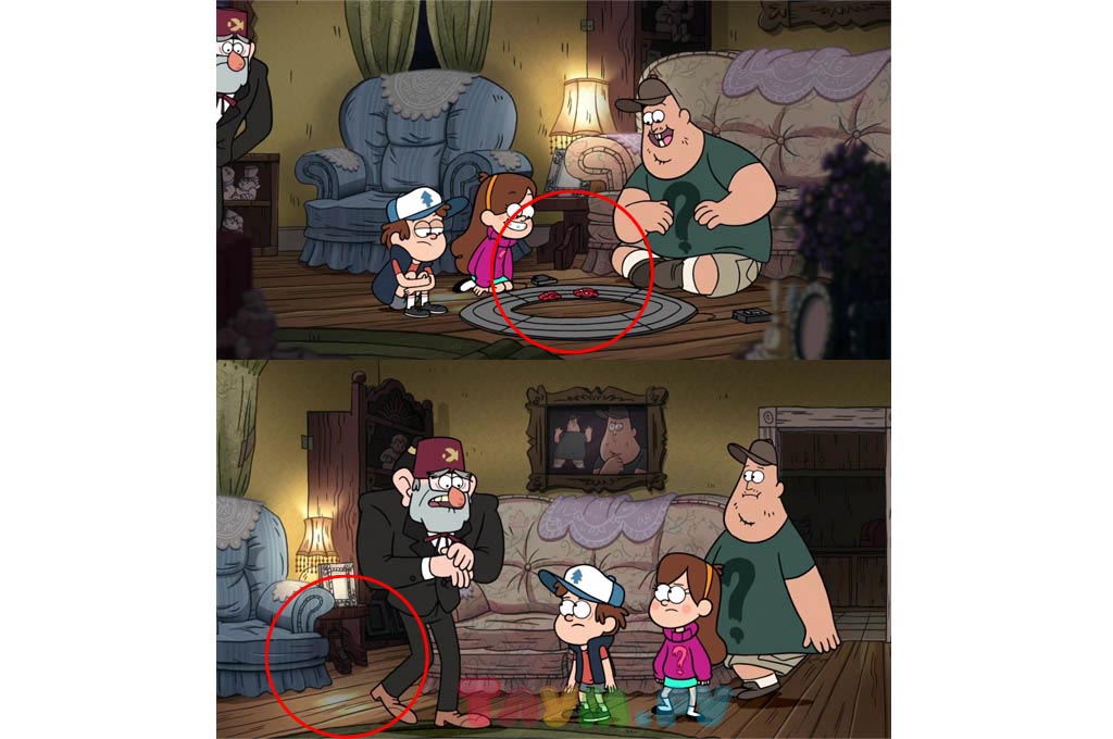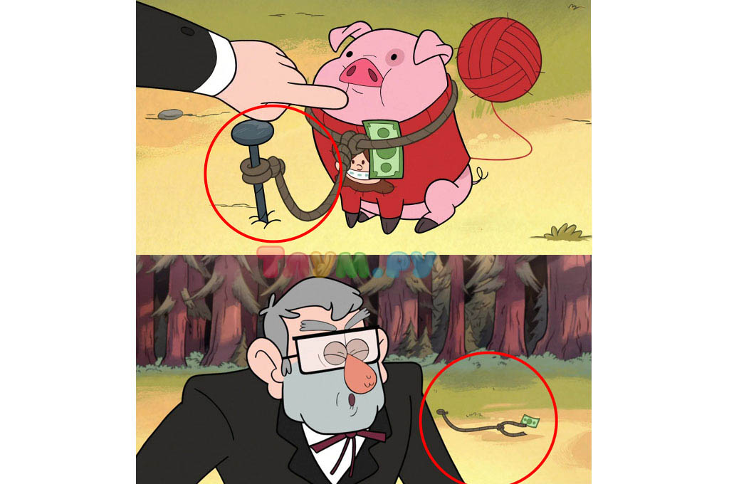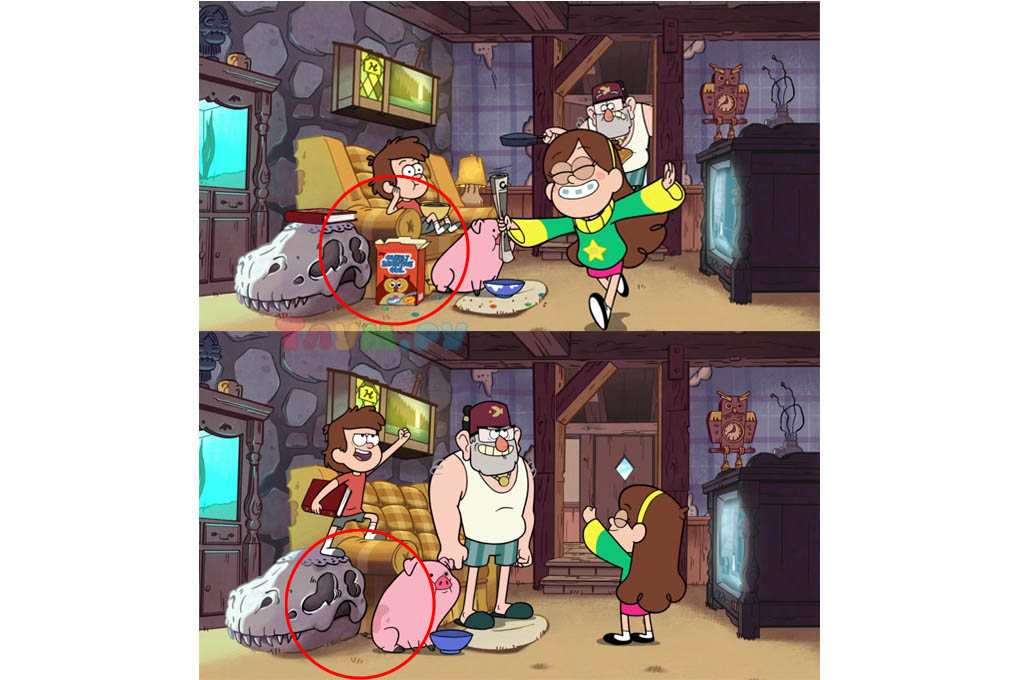 В следующем ляпе можно наблюдать за таинственным исчезновением хлопьев, которые с таким удовольствием поедает Диппер. Хотя, как нам кажется, к этому всё-таки причастен один милый поросёнок — вон, он даже переместился к боку дивана, а его мисочка внезапно стала абсолютно чистой. Нам это кажется очень подозрительным.