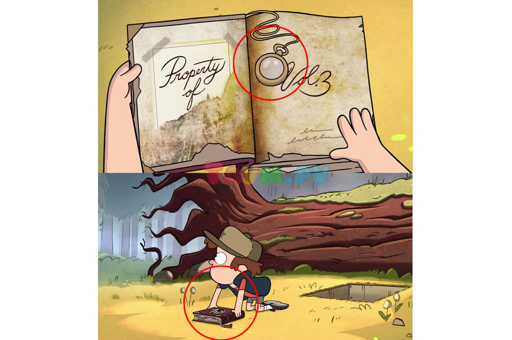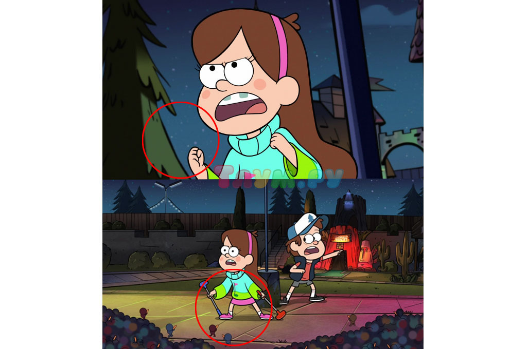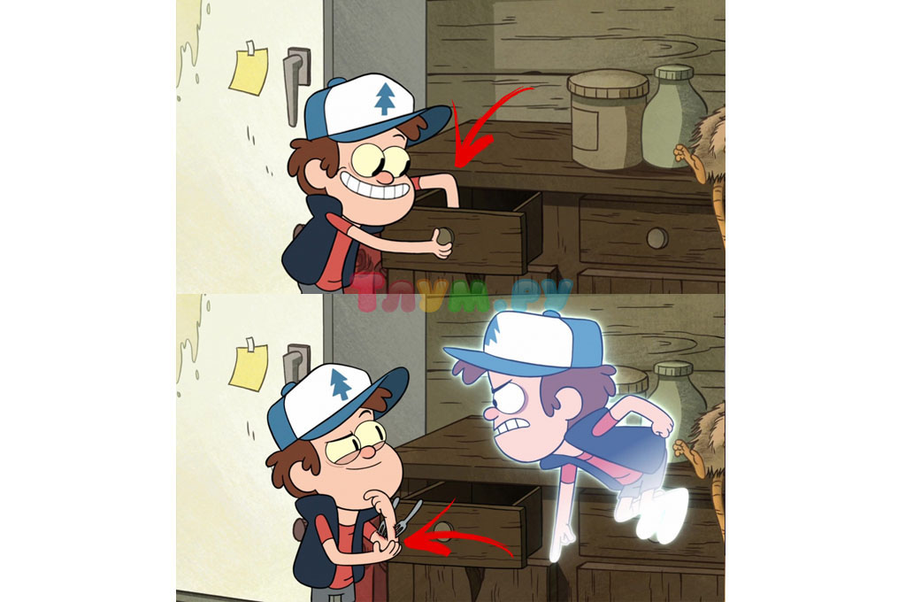 Мы уже поняли, что в мультсериале «Гравити Фолз» многие вещи попросту не подчиняются законам физики. Вот, например, Диппер сначала держит Дневник двумя руками, а затем он убирает одну. При этом обложка Дневника остаётся на том же самом месте, хотя под давлением страниц должна была свеситься вниз.