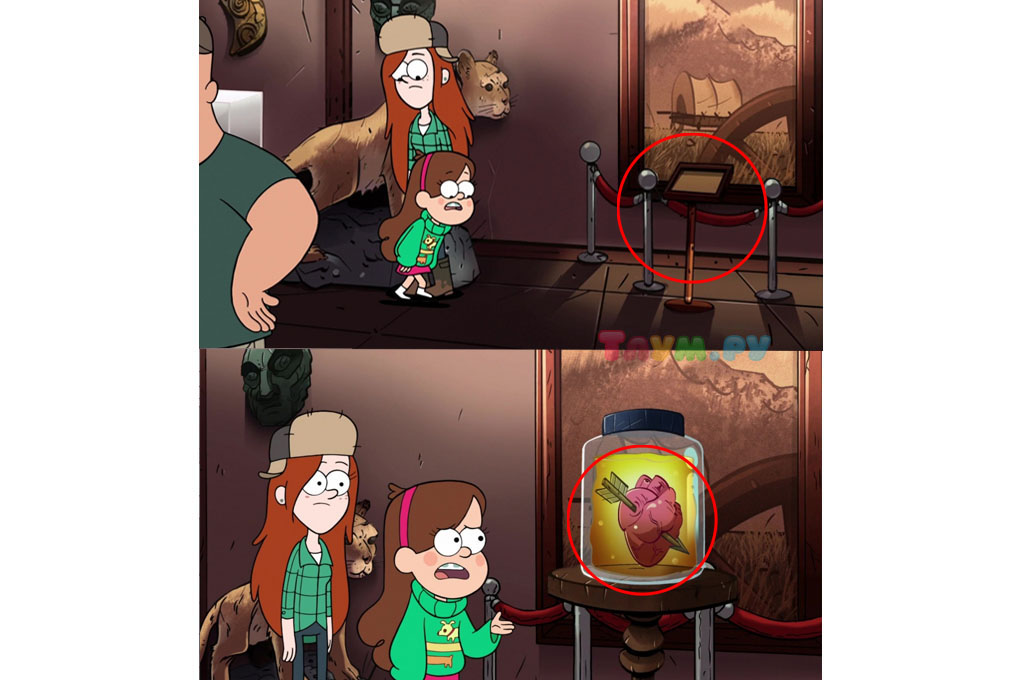 А что насчёт таинственных подмен? Вот грустная Мейбл подходит к картине в музее, и мы видим, что напротив картины стоит табличка, но уже в следующем кадре на этом месте находится стеклянная банка с сердцем, проткнутым стрелой.