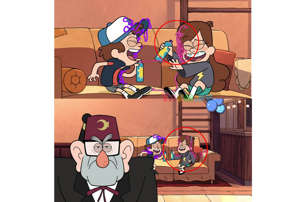 Перед вечеринкой Диппер и Мейбл проверяют на себе развлечения — и балуются с баллончиками с разноцветной пеной. Сначала мы видим, что их лица полностью покрыты цветной пеной, а в следующем кадре в пене уже и волосы Мейбл, и кепка Диппера.