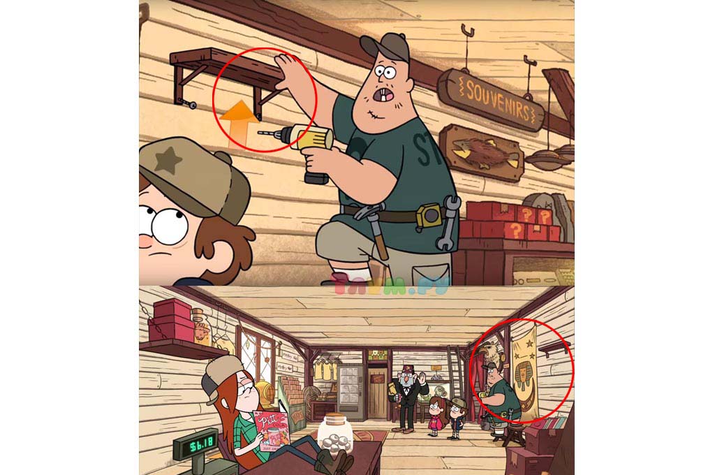 Будем двигаться по порядку. В первой же серии первого сезона нас поджидают загадки. Мы знакомимся с основными персонажами и уже замечаем, что что-то тут не так. Например, в Хижине Чудес Сус, сотрудник лавки, прибивает к стене полку, стоя на стремянке прямо перед ней. В следующем кадре он уже стоит напротив гобелена на стене, а та самая полка уже висит сбоку. Чудеса.