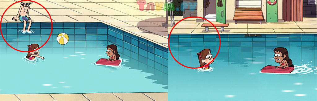 В том же эпизоде Мейбл играет с Русалдо в мяч — правда, русал совсем не настроен на веселье. И вот девочка запускает в друга мячом, и мы можем увидеть, что на бортике бассейна возле неё сидит какой-то мужчина. И как только в голову Русалдо попадает мяч, мужчина таинственным образом исчезает.