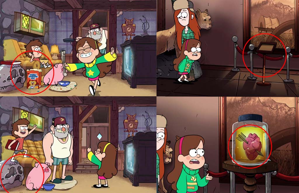 А что насчёт таинственных подмен? Вот грустная Мейбл подходит к картине в музее, и мы видим, что напротив картины стоит табличка, но уже в следующем кадре на этом месте находится стеклянная банка с сердцем, проткнутым стрелой.