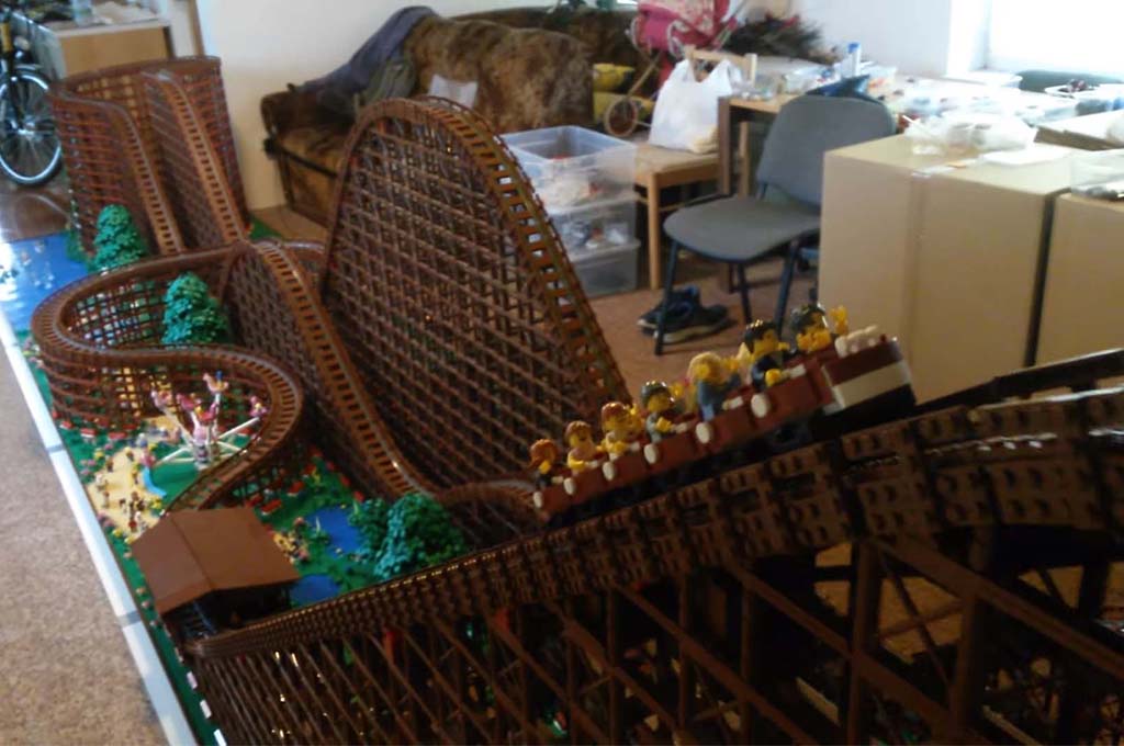Более 90 000 кирпичиков было потрачено на создание этой трассы в 6 метров длиной, однако весь путь человечков в кабинке — 26 метров, а максимальная высота их подъема — 1,4 метра. На создание этого аттракциона у Lunatic ушло 800 часов (почти 5 недель непрерывной работы!), но результат того стоил. Кроме самих горок, автор оформил и местность вокруг: озера, детские площадки — все как в настоящем парке!