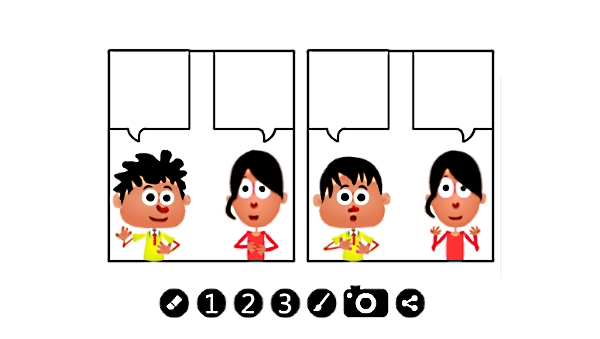 Очень простое приложение для начинающих авторов комиксов. Сцена может состоять из одного-двух-трех кадров, в которых присутствуют два персонажа. Здесь можно немного изменить мимику и поворот лица, написать текст для каждого персонажа, дать в руки предмет из списка.