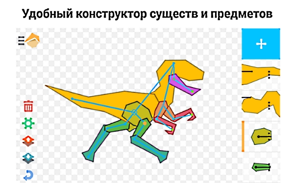 Перед нами интересный проект, который поможет начинающим художникам освоить азы создания мультфильмов на практике. Главное в мультипликации это динамика — когда персонажи от кадра к кадру перемещается по экрану. И вот именно этим и предстоит заниматься. Все фигурки тут имеют некий «скелет», в котором имеются точки сгиба, которые и позволяют изображать движение на экране. Итак, добавляем на экран одну или две фигуры или предмета и готовим первый кадр. Затем переключаемся на второй кадр и вносим небольшие изменения в нашу сцену. Потом переходим к третьему кадру и так далее. В итоге у нас получается простой со стороны мультфильм, однако, очень трудный в создании. Полученный проект можно сохранить на смартфоне как видео, выложить на YouTube, поделиться с друзьями. Большая библиотека «заготовок», возможность создавать новых героев самостоятельно, обучение азам анимации добавляет «веса» этой творческой мастерской, так что смело ставим 4+!