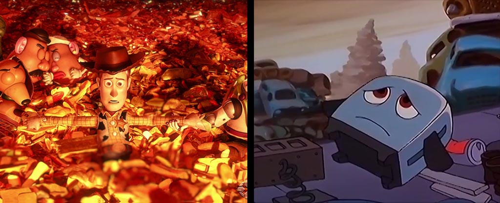 Поговорим об «Истории игрушек 3»? Ее сравнивают с «Отважным маленьким тостером» (1987). Ребенок отправляется в колледж, а его любимые игрушки или бытовая техника (нужное подчеркнуть) из-за нелепой случайности оказываются где-то не там. Но, объединившись и помогая друг другу, храбрые герои добираются до дома хозяина и… не воссоединяются с ним. А еще по дороге им встречается свалка и успешно избегается смерть на конвейере.