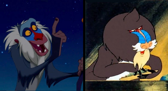 А вот на второй взгляд заимствования вылезают одно за другим. Вот Кимба с Симбой с их очаровательными черными отметинками на ушках. Вот почти одинаковые глупые гиены. Вот мудрый бабуин, раздающий жизненные советы в обоих мультфильмах.