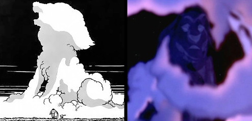 Да что там персонажи — даже ряд сцен был фактически срисован: летящие аисты, разговор с призрачным облачным предком, пафосно бегущий главный герой… Посмотрите на сам сценарий — и там, и там это история о детеныше могучего правителя, возглавляющего общество разумных животных. И там, и там этот правитель трагически гибнет в начале ленты (отца Кимбы убивают охотники), обоим малышам приходится бежать и скрываться, чтобы позже вернуться и отомстить обидчикам. На пути им встречаются положительные герои с философским подходом к жизни, а в конце они возвращают то, что им принадлежит по праву. Такое вот совпадение. Но совпадение ли?